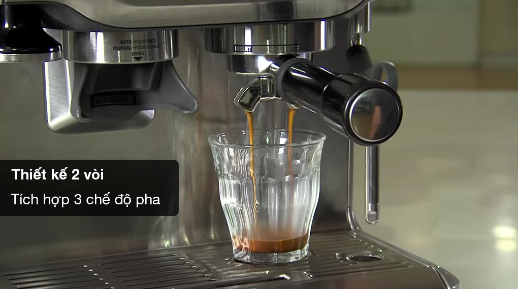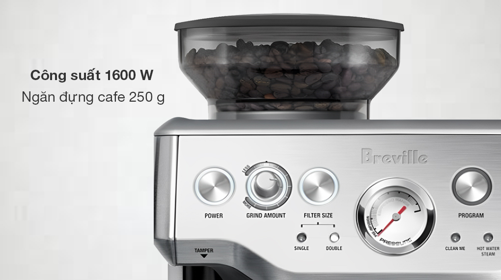 Máy pha cafe bán tự động Breville có công suất hoạt động ổn định và mạnh mẽ lên đến 1850 W. Máy có thể sử dụng cafe dạng hạt hoặc bột với ngăn đựng nguyên liệu có sức chứa 250 g. Ngoài ra, dung tích của bình chứa nước đạt khoảng 2 lít.