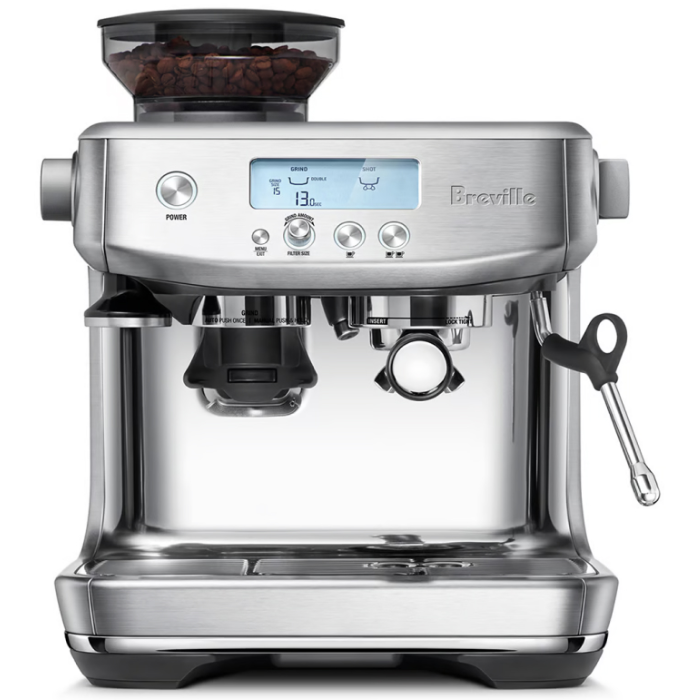 Breville BES878 the Barista Pro sở hữu lớp vỏ thép không gỉ cao cấp, mang đến vẻ ngoài sang trọng và độ bền vượt trội. Màn hình LCD trực quan giúp hiển thị đầy đủ thông tin, hỗ trợ thao tác dễ dàng. Phễu đựng 54mm kết hợp vòi đánh sữa microfoam tạo bọt mịn, nâng tầm hương vị cà phê.