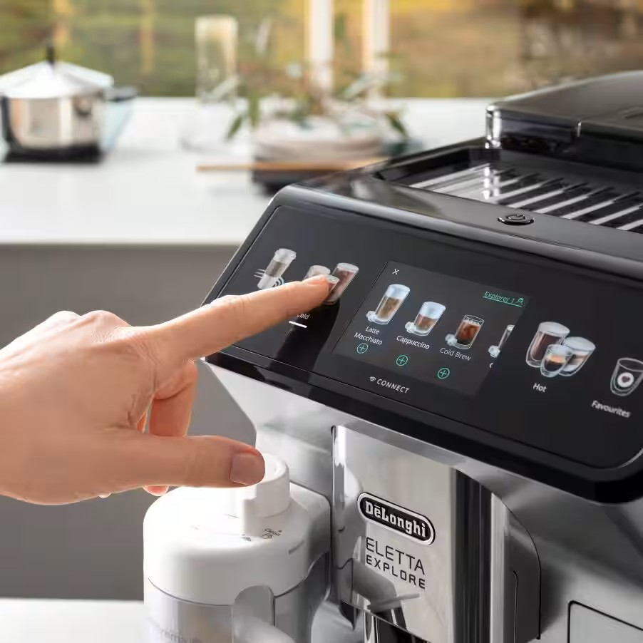 Thưởng thức cà phê chất lượng cao với vô vàn lựa chọn chỉ với một chạm, từ cà phê nóng, lạnh cho đến Cold Brew với máy pha cà phê tự động De'Longhi Eletta Explore. Công nghệ LatteCrema Nóng giúp bạn tạo lớp bọt sữa nóng hoàn hảo, cho những ly cà phê thơm ngon. Còn LatteCrema Lạnh và Công nghệ Chiết Xuất Lạnh sẽ mang đến các thức uống lạnh và cà phê Cold Brew sảng khoái. Giờ đây, bạn có thể tận hưởng hương vị cà phê yêu thích như tại quán ngay tại nhà hoặc mọi nơi với tính năng "To Go" độc đáo