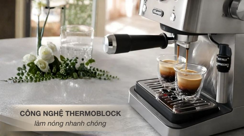 Máy pha cà phê Delonghi EM450.M được trang bị công nghệ Thermoblock hiện đại, cho khả năng làm nóng gần như tức thì ngay khi khởi động. Nhờ đó, người dùng không cần chờ đợi lâu mà vẫn có thể bắt đầu pha chế nhanh chóng.