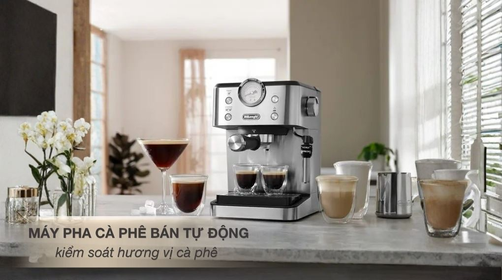 Delonghi EM450.M là lựa chọn phù hợp cho người yêu cà phê muốn trải nghiệm pha chế tại nhà hoặc văn phòng nhỏ. Sản phẩm nổi bật với thiết kế bền bỉ, thao tác dễ dùng và khả năng tạo ra những ly cà phê chuẩn vị một cách nhanh chóng.