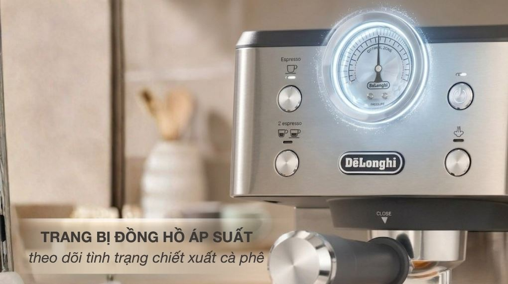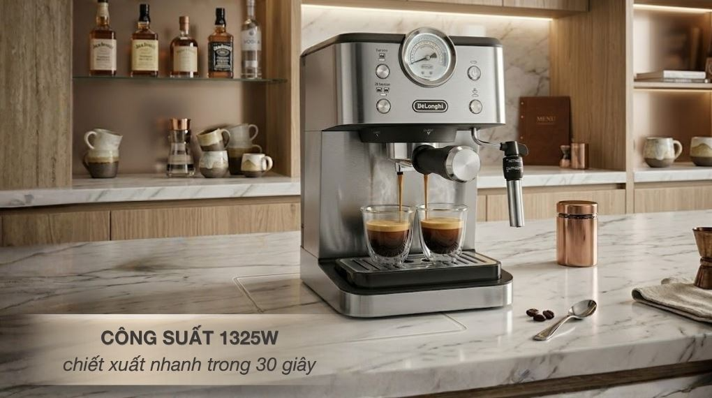 Máy pha cà phê Delonghi hoạt động với công suất 1325W, đảm bảo khả năng gia nhiệt nhanh và duy trì nhiệt độ ổn định trong suốt quá trình pha.