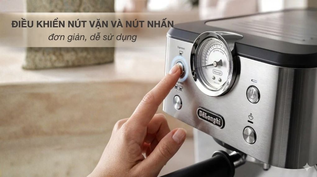 Bạn có thể điều khiển máy pha cà phê thông qua nút vặn và nút nhấn được bố trí ngay trên thân máy, mang lại thao tác trực quan và dễ làm quen, phù hợp cho cả người mới bắt đầu.