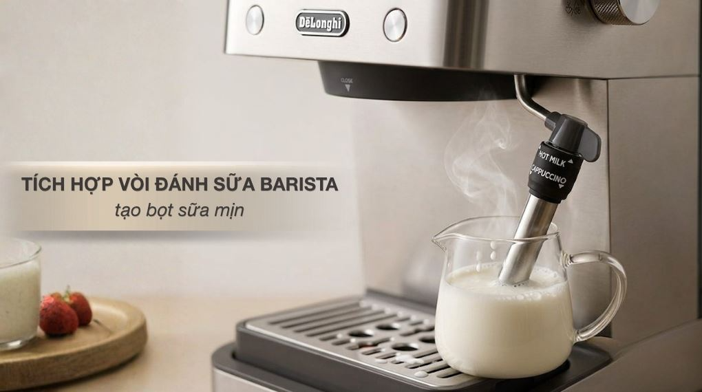Máy còn được trang bị vòi đánh sữa chuẩn barista, tích hợp 2 chế độ Cappuccino và Hot Milk, giúp người dùng dễ dàng tùy chỉnh theo nhu cầu pha chế mà không cần thao tác phức tạp. Nhờ đó, việc tạo bọt sữa mịn hay làm nóng sữa trở nên đơn giản hơn, phù hợp cả với người mới bắt đầu. Đây là điểm cộng lớn cho người dùng yêu thích đa dạng phong cách cà phê.