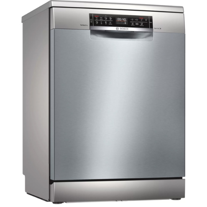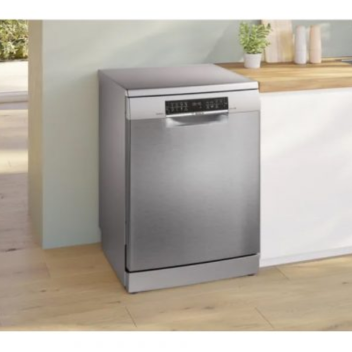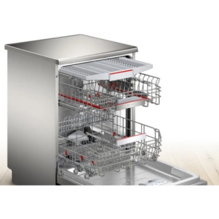 Máy rửa chén Bosch SMS6ZCI85M Series 6 là dòng máy rửa bát độc lập cao cấp với dung tích lớn chứa tới 14 bộ bát đĩa chuẩn châu Âu, phù hợp cho gia đình đông người hoặc những gia đình có nhu cầu rửa nhiều bát đĩa trong một lần. Sản phẩm được thiết kế sang trọng với màu inox bạc hiện đại, vỏ máy làm từ thép không gỉ cao cấp, bền bỉ và dễ vệ sinh. Bosch SMS6ZCI85M tích hợp nhiều công nghệ tiên tiến như công nghệ sấy Zeolith giúp làm khô hiệu quả, cảm biến AquaSensor tự động điều chỉnh lượng nước, cùng hệ thống giỏ VarioFlex Plus và ngăn kéo VarioDrawer tối ưu không gian chứa. Máy vận hành êm ái với độ ồn chỉ 42 dB, mang lại sự yên tĩnh cho không gian sống.