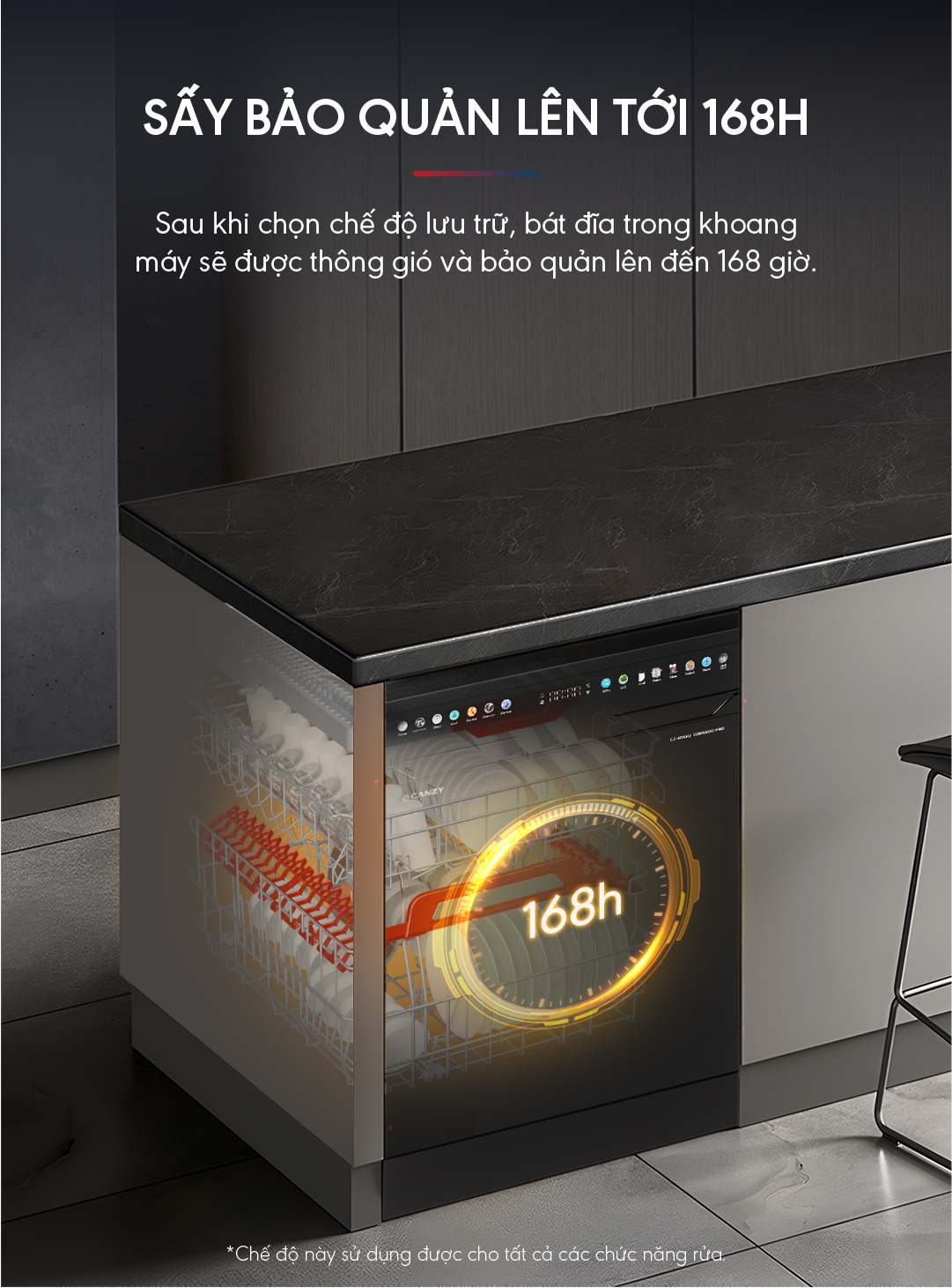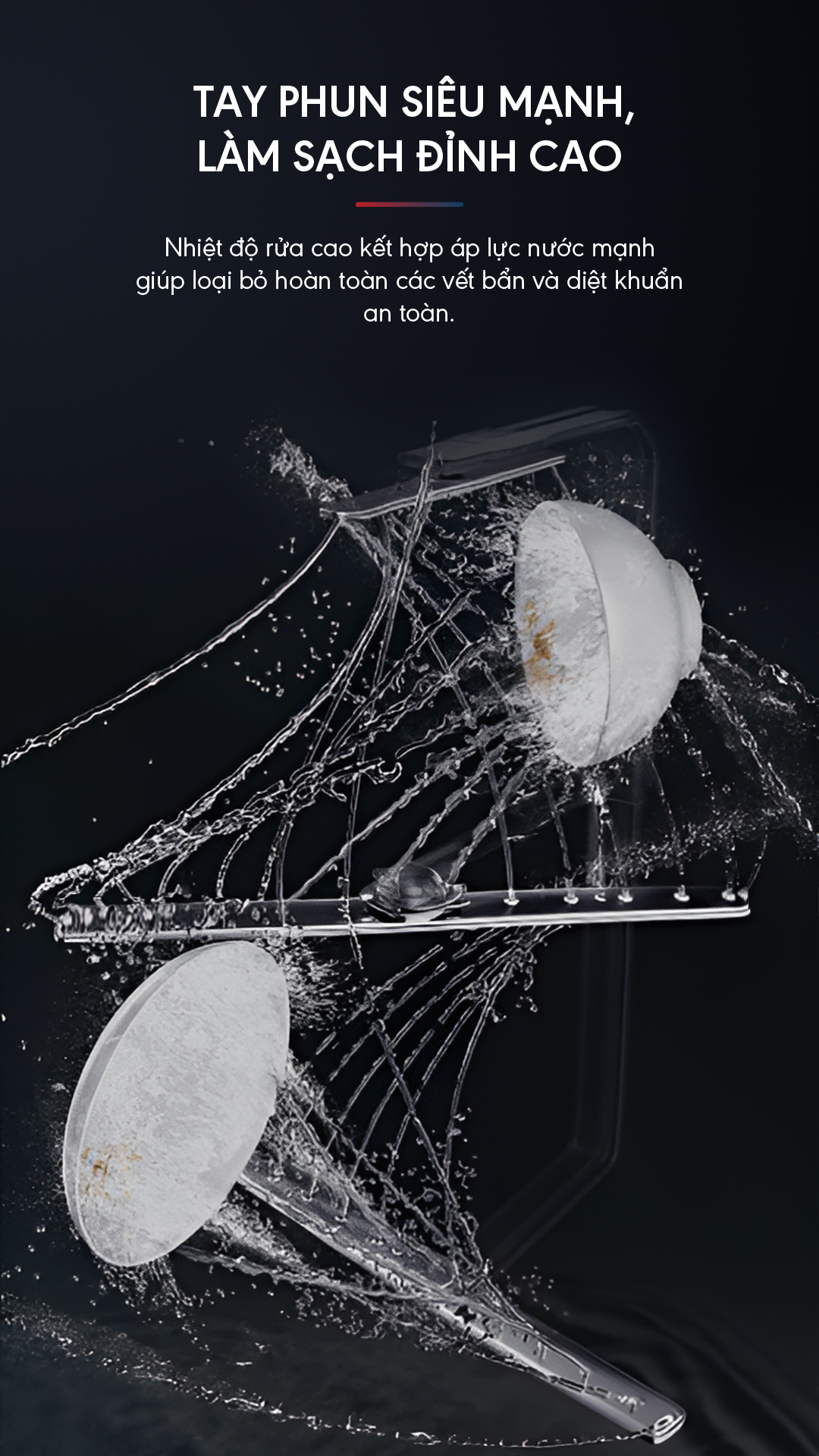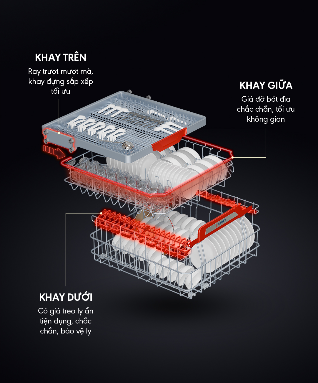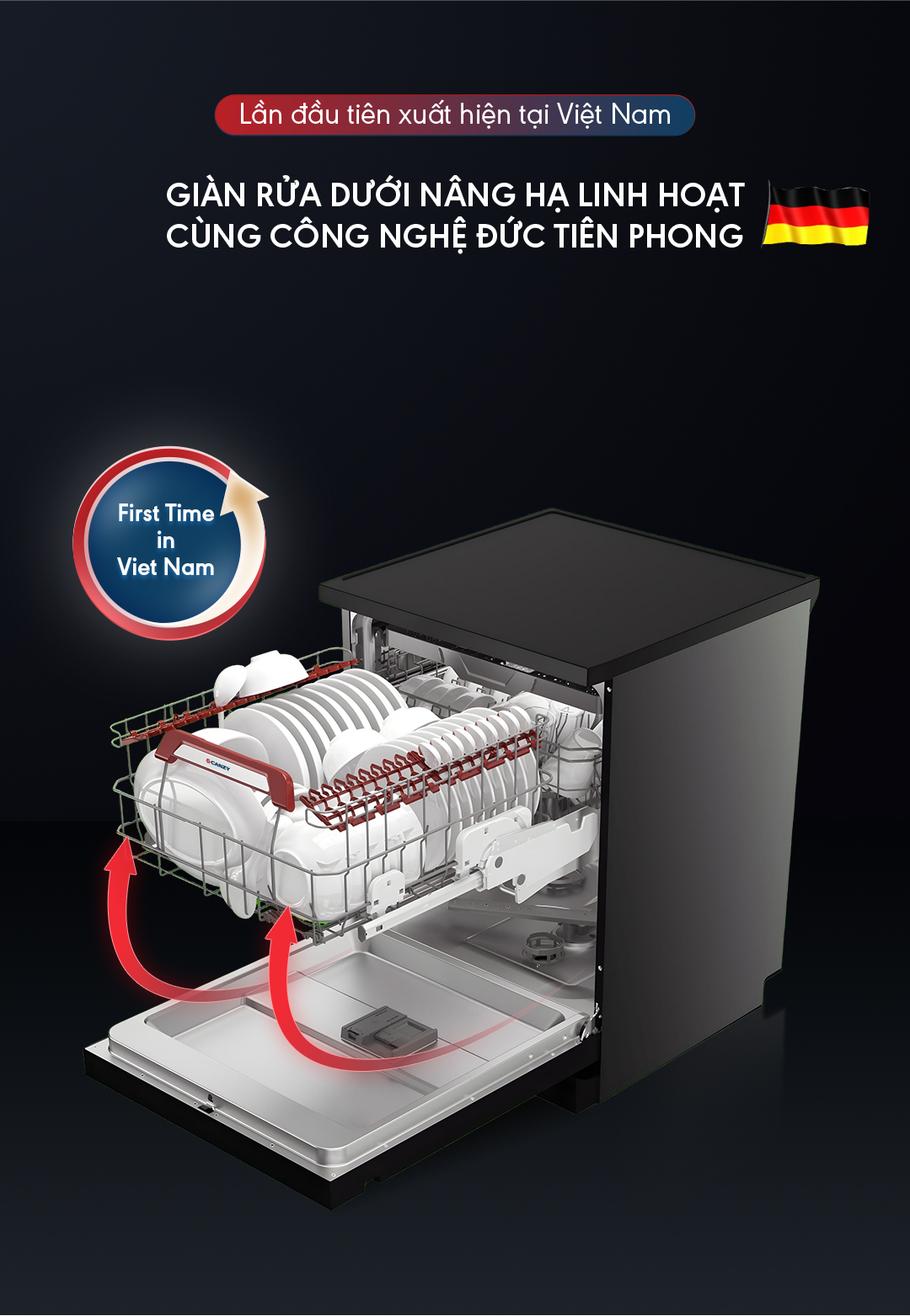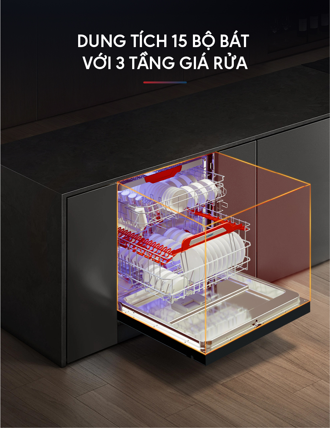 - Dung tích: 15 bộ, 3 tầng giá rửa, giàn rửa dưới có thể nâng hạ