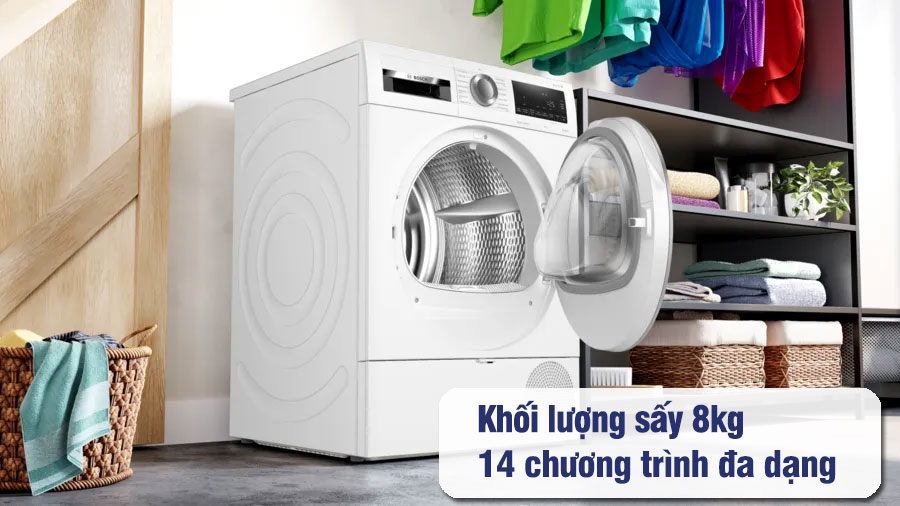 - Máy sấy bơm nhiệt này đáp ứng khối lượng quần áo sấy đến 8kg, phù hợp cho những hộ gia đình có số thành viên từ 2 - 4 người.