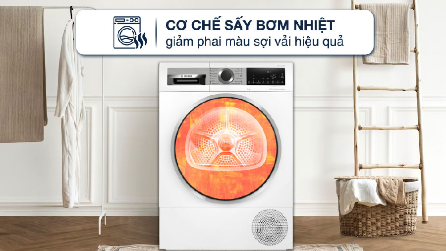 - Cơ chế: sấy bơm nhiệt là một giải pháp sấy quần áo hiệu quả, với khả năng duy trì mức nhiệt độ vừa phải, từ đó giúp giảm nguy cơ phai màu sợi vải. Đồng thời, cơ chế hoạt động của máy còn giúp hạn chế sự thoát ra bên ngoài của hơi nóng, đặc biệt quan trọng cho các gia đình có trẻ nhỏ và thú nuôi trong nhà.