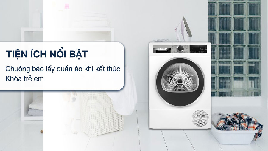 - Khóa trẻ em: khi sử dụng sẽ vô hiệu hóa bảng điều khiển, giúp bảo vệ trẻ nhỏ và ngăn trẻ thay đổi các cài đặt trước đó, đảm bảo quá trình sấy trơn tru, không bị gián đoạn.