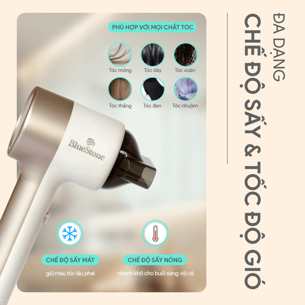 Không phải ai cũng có cùng một kiểu tóc, dù bạn sở hữu mái tóc mỏng yếu, tóc dày bồng bềnh hay tóc xoăn cá tính, với BlueStone HDB-1831 đều phù hợp để sấy khô mà không ảnh hưởng đến chất tóc của bạn. Với 2 tốc độ gió và chế độ sấy mát riêng biệt, giúp bạn linh hoạt điều chỉnh để bảo vệ mái tóc theo từng nhu cầu: