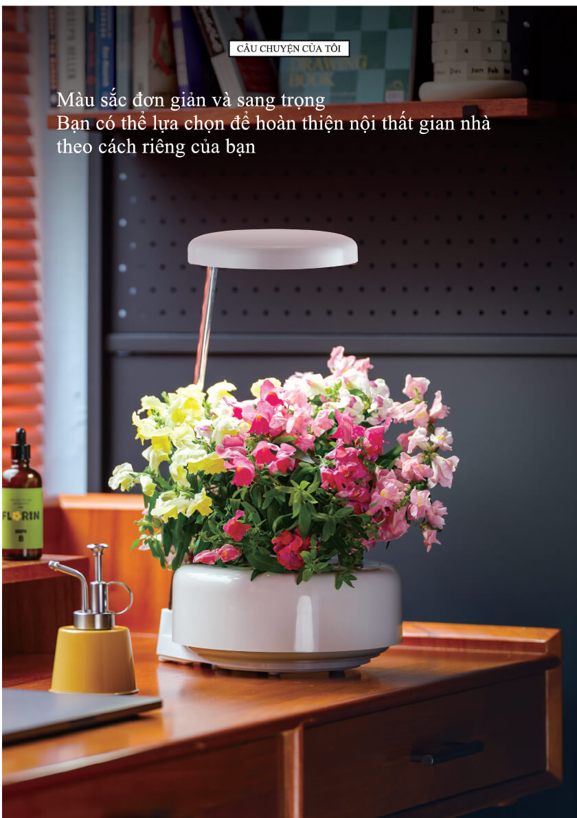 Wells Florin cho phép bạn dễ dàng chăm sóc và thay đổi các loại hoa theo mùa như hoa mào gà, hoa cúc mặt trời, và hoa kim ngư thảo. Máy sử dụng công nghệ đèn LED tăng trưởng tiên tiến với bước sóng ánh sáng tối ưu, đảm bảo sự phát triển mạnh mẽ của hoa ngay cả khi không có ánh sáng tự nhiên. Đây là một phụ kiện trang trí nội thất sang trọng, lý tưởng cho phòng khách, bàn làm việc, hoặc phòng nghiên cứu.