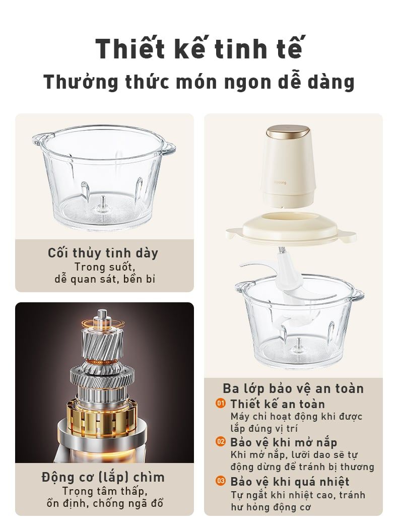 - 3 Tính năng bảo vệ người dùng: Chỉ hoạt động khi lắp đúng vị trí, Lưỡi dao ngừng quay khi mở nắp, Tự ngắt điện khi quá nhiệt.