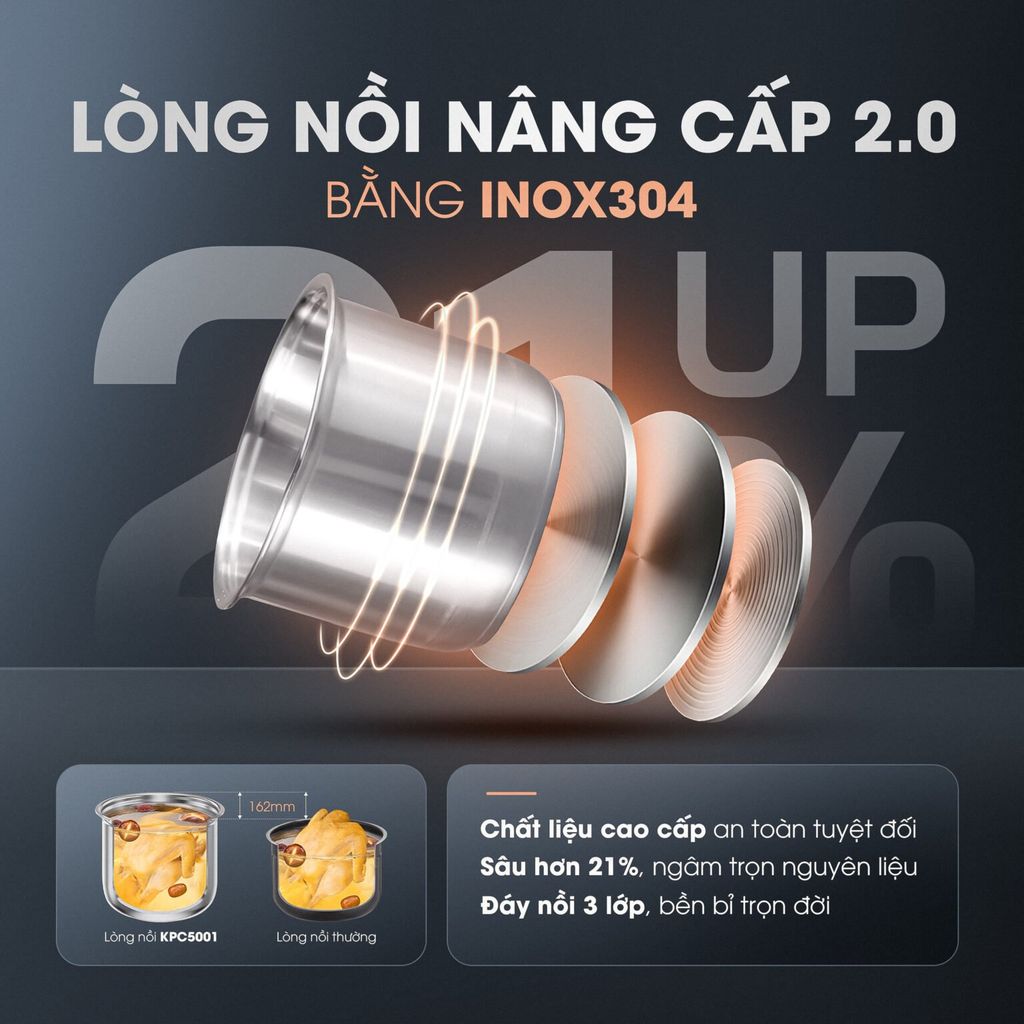 Lòng nồi KALITE KPC5001 được nâng cấp 2.0 với chất liệu inox 304 cao cấp, an toàn tuyệt đối cho sức khỏe. Đáy nồi 3 lớp bền bỉ và khả năng giữ nhiệt tốt giúp tiết kiệm năng lượng đáng kể. Đặc biệt, thiết kế sâu hơn 21% so với nồi thông thường giúp ngâm trọn nguyên liệu, đảm bảo thực phẩm được nấu chín đều và thấm vị.
