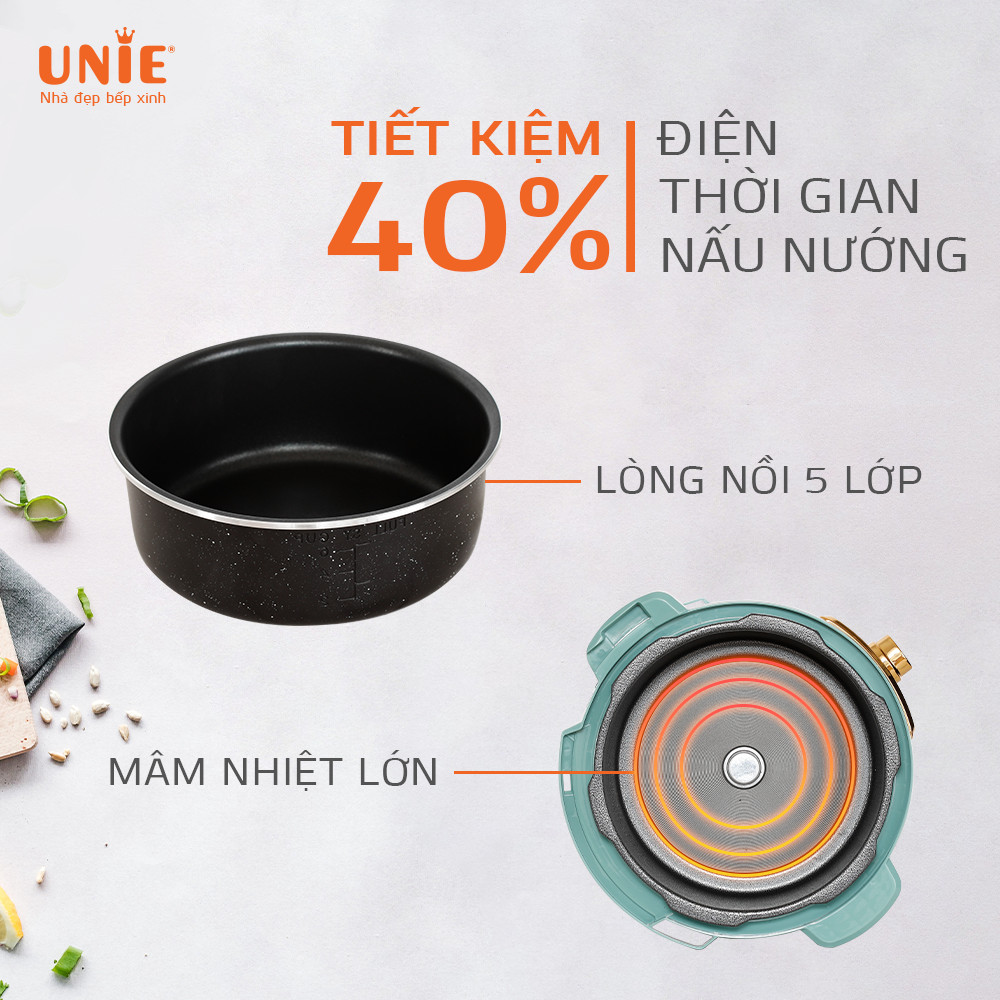Nồi áp suất đa năng Unie UN630 có công suất 1000W giúp việc nấu ăn trở lên nhanh chóng và tiếp kiệm rất nhiều thời gian so với các dòng thông thường. Và với nguyên lý hoạt động nấu chín thức ăn sau đó sẽ tự động chuyển sang chế độ giữ nóng sẽ giúp bạn tiếp kiệm được rất nhiều điện năng cũng như việc kiểm soát thực phẩm nấu được dễ dàng hơn.