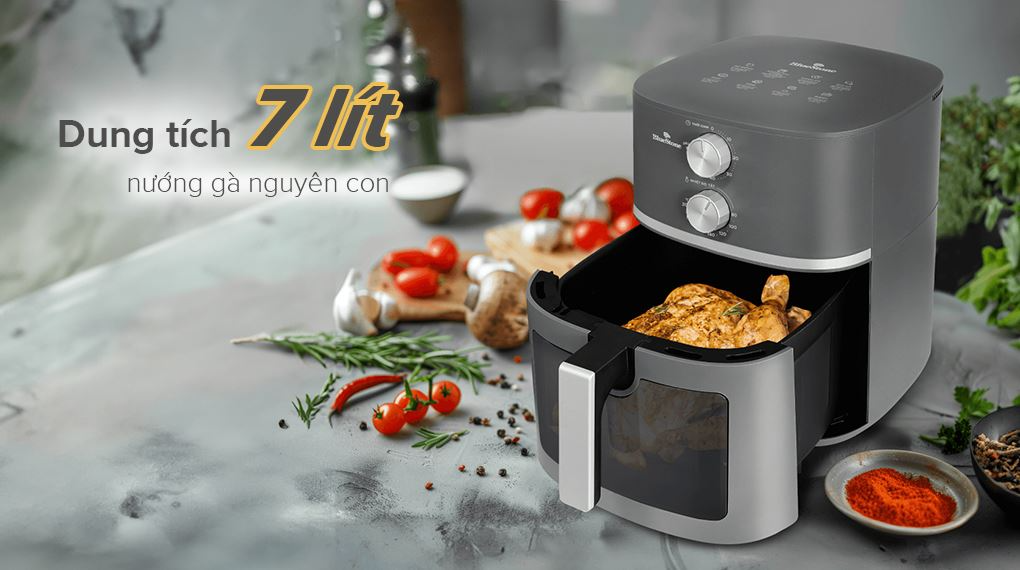 Nồi chiên không dầu có dung tích 7 lít, chiên được gà nguyên con khoảng 1.5 kg.