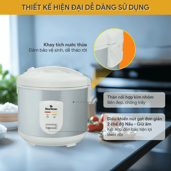 Nồi cơm nắp gài Bluestone RCB-5517 dung tích 1.2 lít với thiết kế tối ưu giúp cơm nhanh chín, dẻo ngon. Nồi chống dính dễ dàng vệ sinh, cùng màu sắc nhẹ nhàng, hài hòa, phù hợp với nhiều không gian bếp.