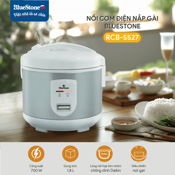 Nồi cơm nắp gài Bluestone RCB-5527 với công suất lên tới 700W giúp gia nhiệt nhanh hơn, cơm chín nhanh chóng tiết kiệm thời gian nấu. Nồi có dung tích lớn 1.8 lít, phù hợp với gia đình 2 - 6 thành viên, đảm bảo bữa cơm ngon về chất lượng cũng như số lượng.