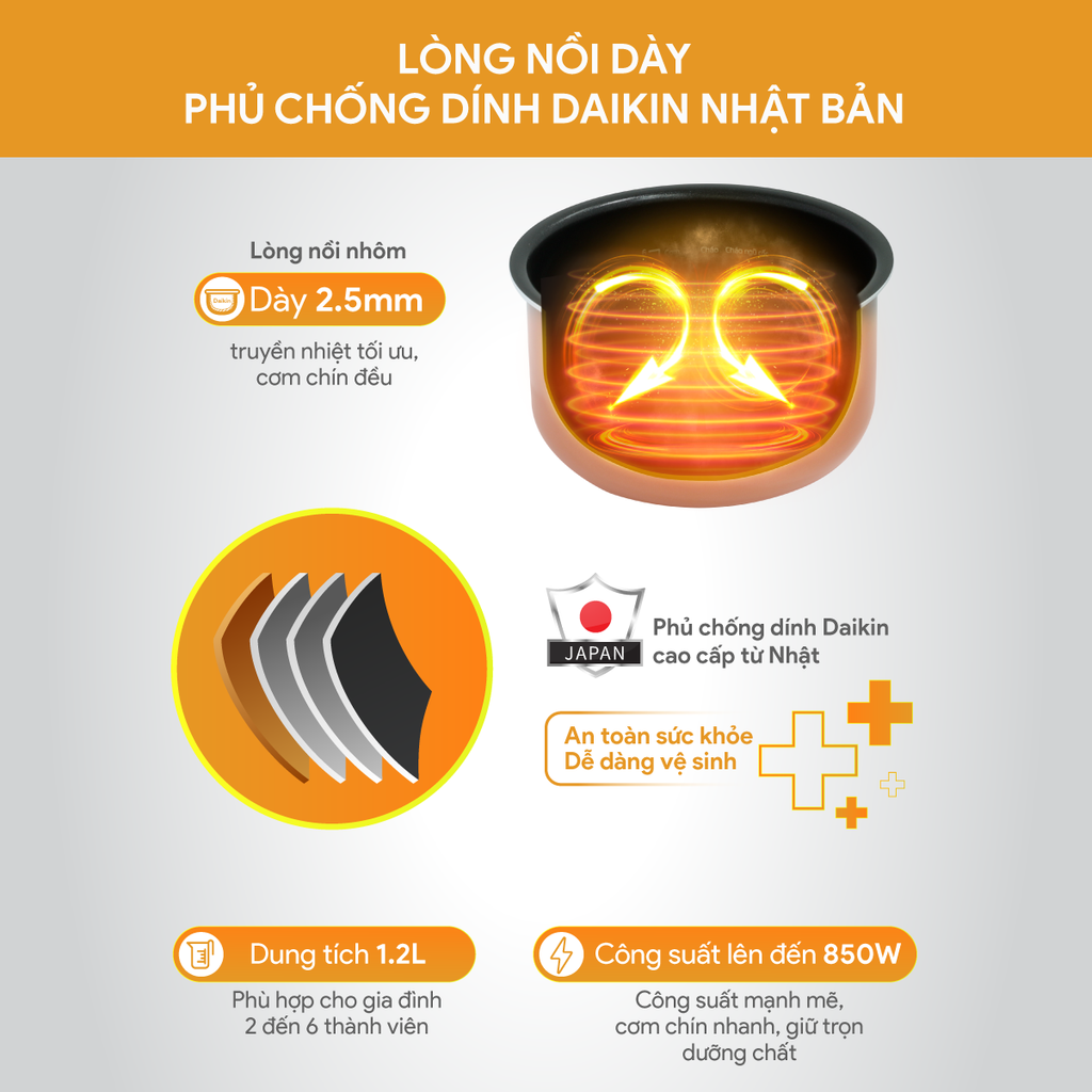 Lòng nồi nhôm dày 2.5 mm với lớp chống dính cao cấp, thuận tiện vệ sinh, cơm chín đều thơm ngon trọn vị.