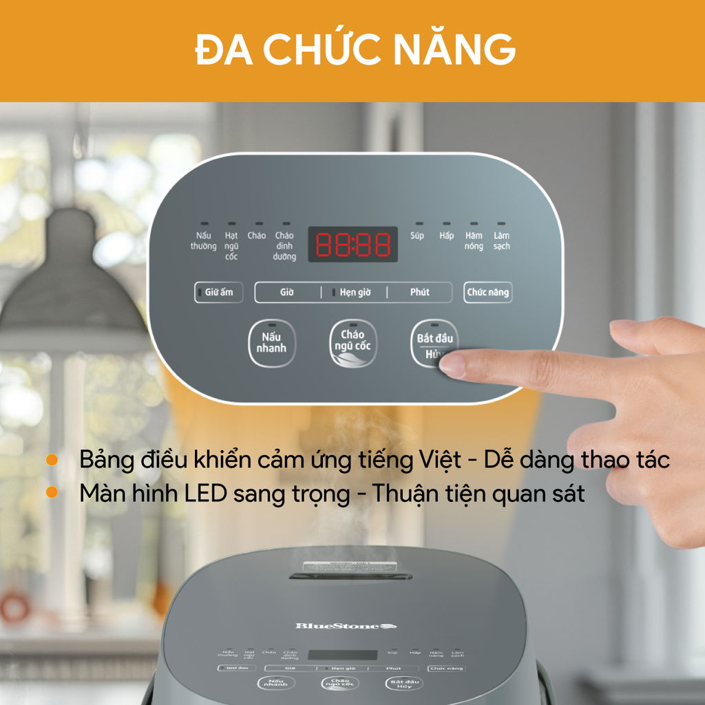 Với đa chức năng tích hợp nhiều chế độ tự động từ nấu thường đến hạt ngũ cốc, nấu cháo, súp, hấp, hâm nóng và đặc biệt còn có chức năng làm sạch nồi, tiết kiệm thời gian. Bảng điều khiển cảm ứng nhưng hiển thị bằng Tiếng Việt nên dễ dàng thao tác, lựa chọn. Màn hình led sang trọng, thuận tiện quan sát.
