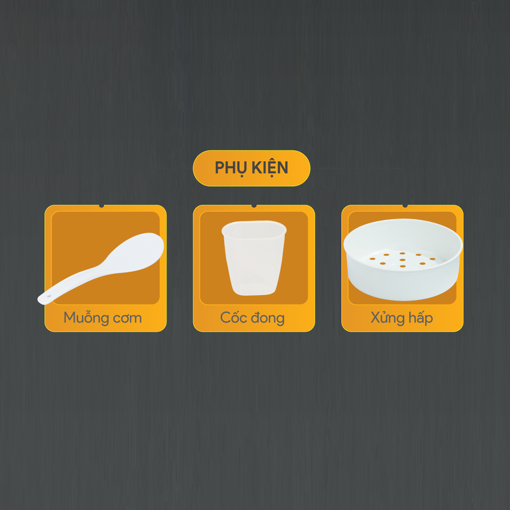 Phụ kiện: Xửng hấp, muỗng cơm, muỗng canh, cốc đong.