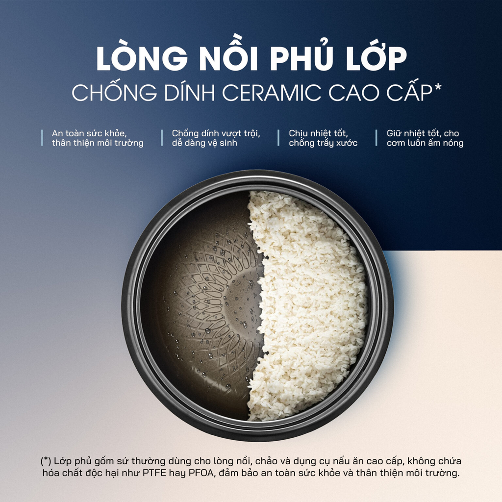 - Lớp chống dính Ceramic cao cấp: Hạn chế cơm bám dính, dễ dàng vệ sinh.