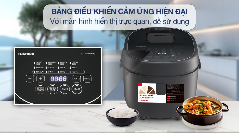 Với thiết kế hiện đại nhưng không kém phần sang trọng, tích hợp 10 chương trình cài đặt sẵn tiện lợi, chức năng hẹn giờ và giữ ấm lên đến 24 giờ cho phép người dùng tự chủ và tiết kiệm thời gian, nồi cơm điện tử Toshiba 1.8 lít RC-18DR4TVN(H) sẽ là một trợ thủ đắc lực giúp bạn thảnh thơi hơn trong việc bếp núc.