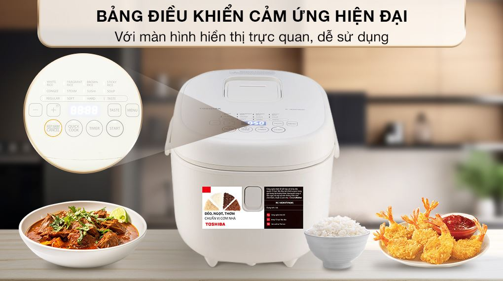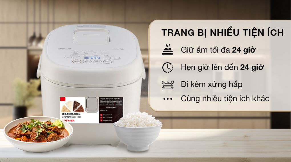 Với thiết kế hiện đại nhưng không kém phần sang trọng, tích hợp 10 chương trình cài đặt sẵn tiện lợi, chức năng hẹn giờ và giữ ấm lên đến 24 giờ cho phép người dùng tự chủ và tiết kiệm thời gian, nồi cơm điện tử Toshiba 1.8 lít RC-18DR4TVN(W) sẽ là một trợ thủ đắc lực giúp bạn thảnh thơi hơn trong việc bếp núc.
