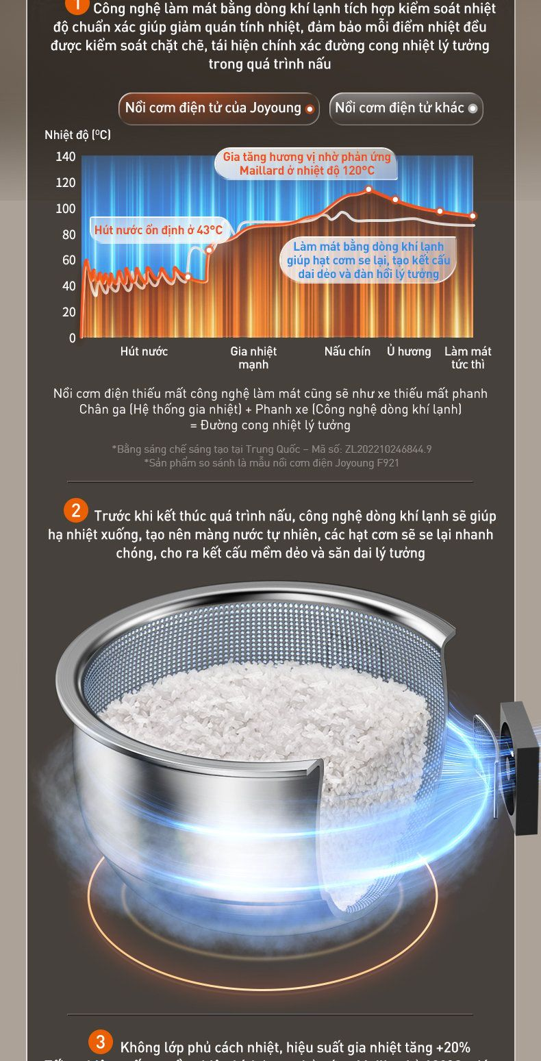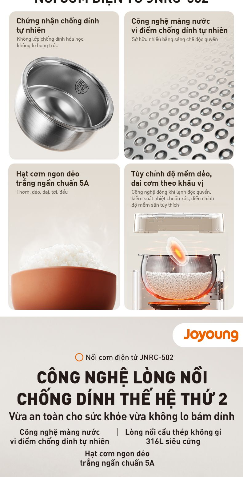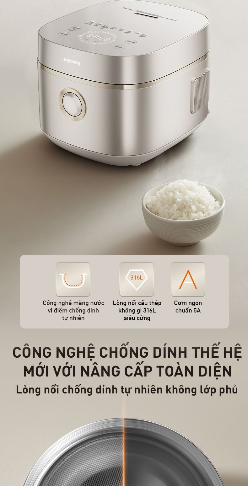 Nồi cơm điện tử Joyoung JNRC-502 sẽ mang đến gia đình bạn những bữa ăn ngon, chất lượng với hạt cơm đạt chuẩn 5A về độ thơm, dẻo, dai, tơi và đều. Đồng thời, công nghệ màng nước vi điểm chống dính tự nhiên còn giúp hạn chế tình trạng bám dính vượt trội