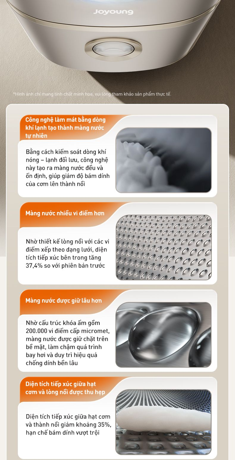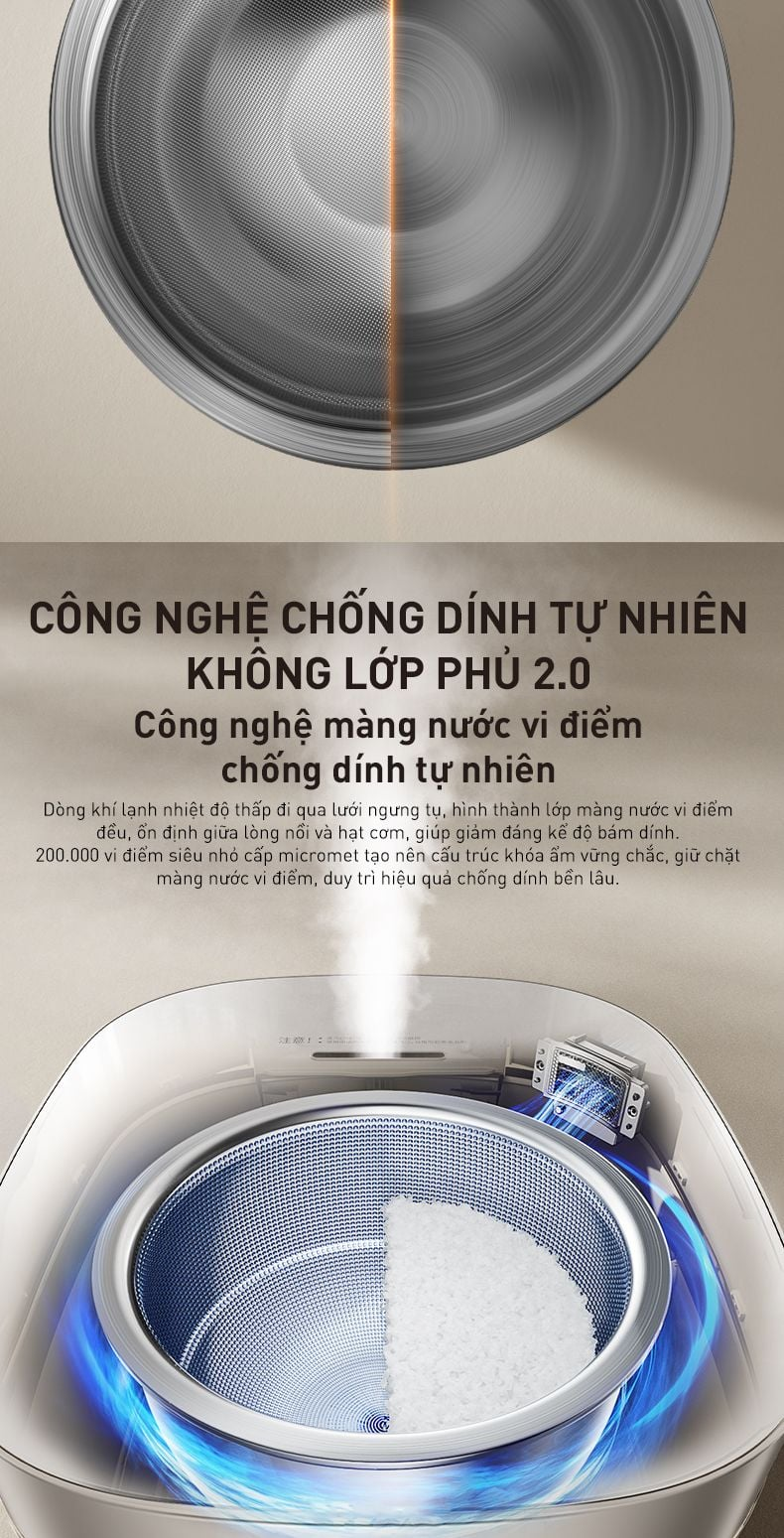 - Công nghệ màng nước vi điểm chống dính tự nhiên: Màng nước gồm 200.000 vi điểm siêu nhỏ cấp micromet giữa lòng nồi và hạt cơm, giúp khóa ẩm và chống dính bền lâu.