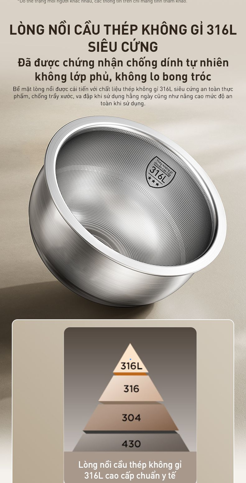 - Lòng nồi cầu thép không gỉ 316L siêu cứng: Đạt chuẩn y tế, chống trầy xước, va đập khi sử dụng hằng ngày cũng như nâng cao mức độ an toàn khi sử dụng.