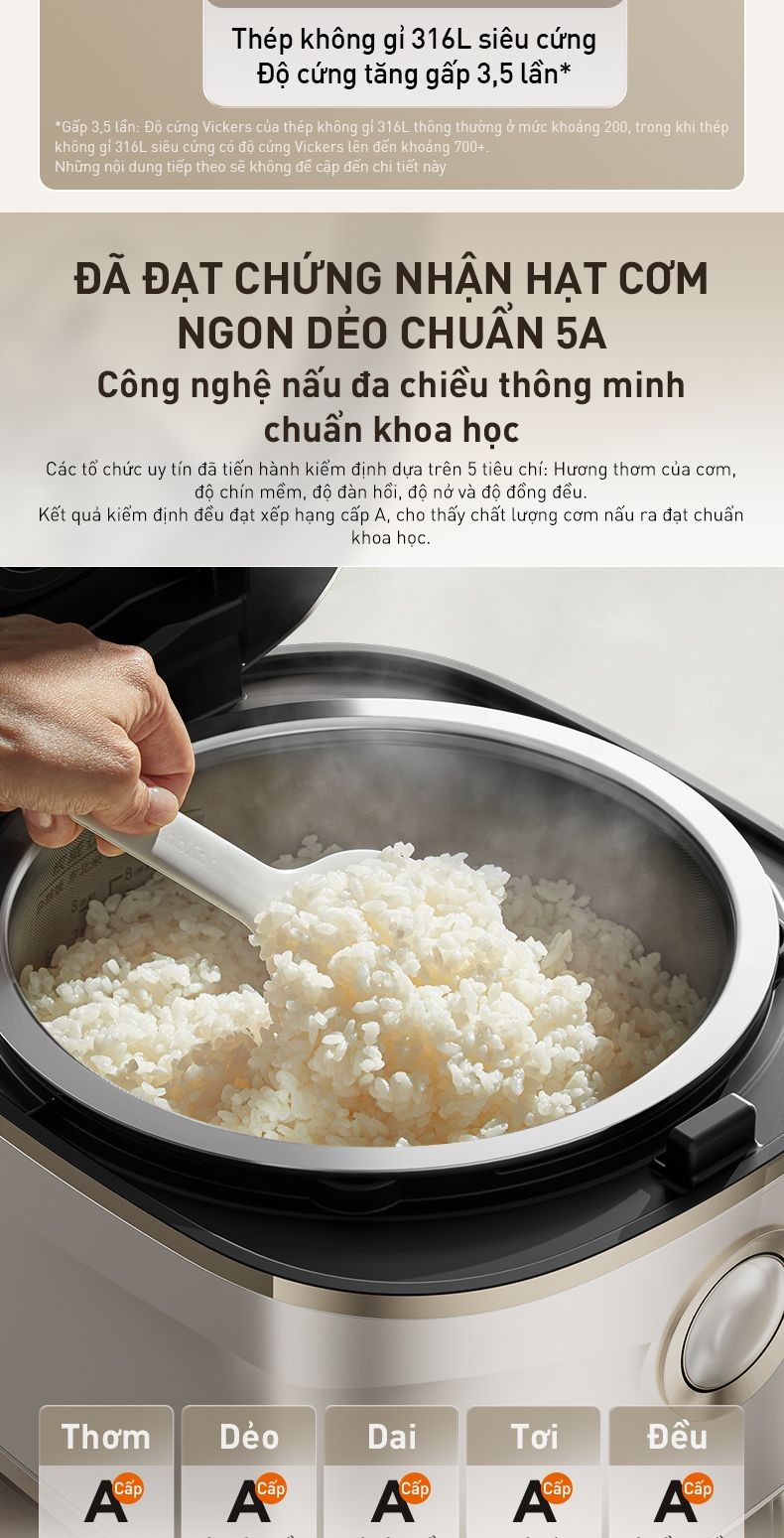 - Cơm ngon đạt chuẩn 5A: Kết quả kiểm định đều đạt xếp hạng cấp A: Thơm, dẻo, dai, tơi, đều.