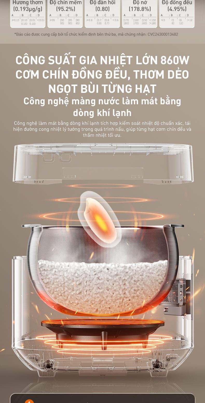- Công suất gia nhiệt lớn 860W: Cơm chín đồng đều, thơm dẻo ngọt bùi từng hạt, tái hiện đường cong nhiệt lý tưởng trong quá trình nấu.