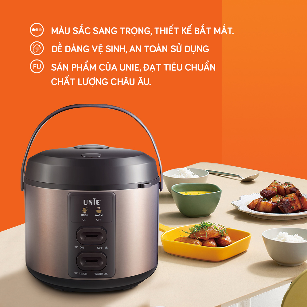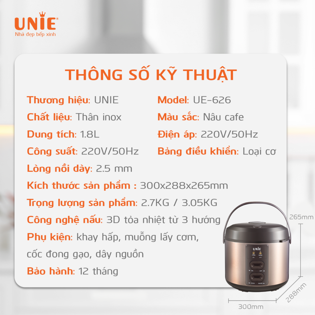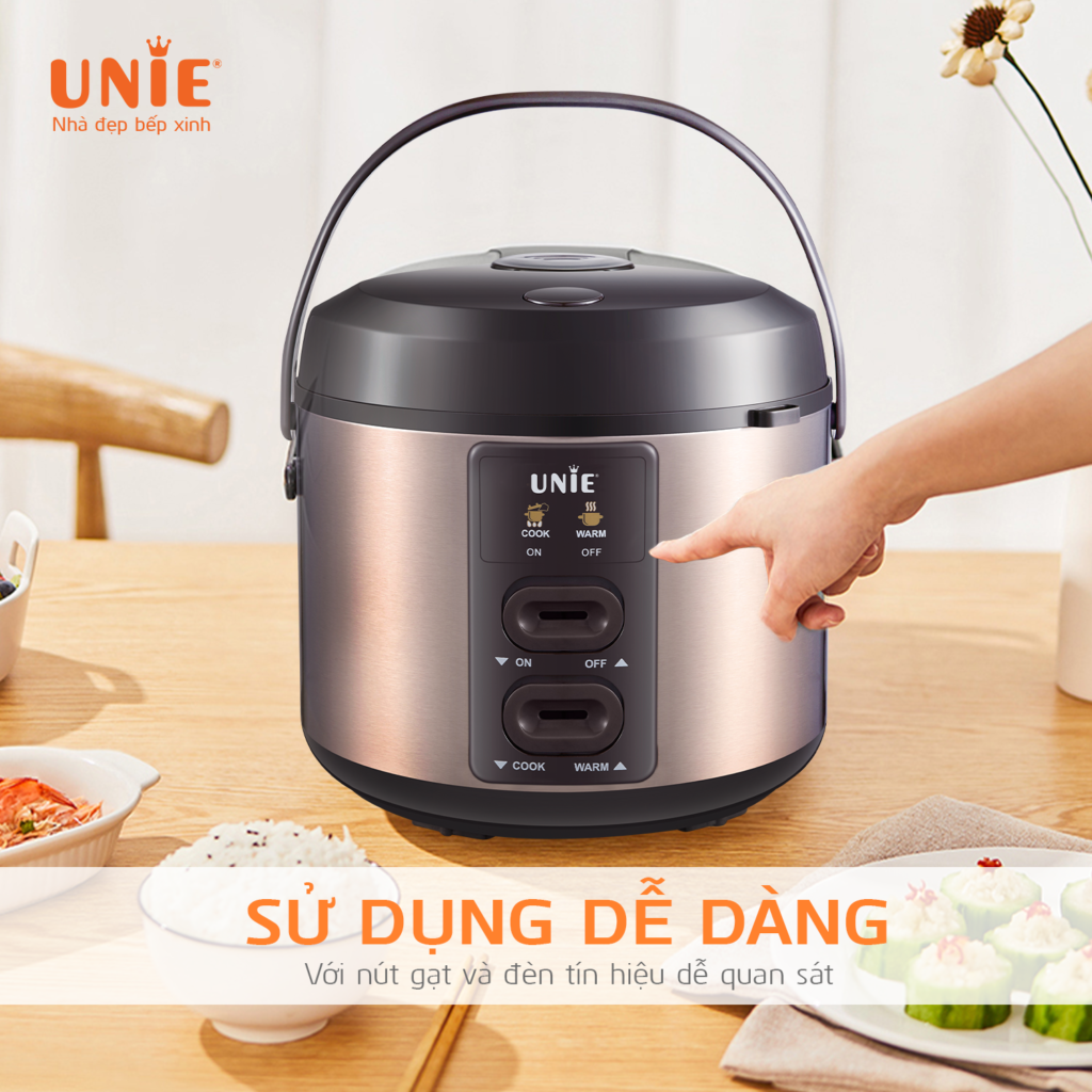 Nồi cơm điện là thiết bị gia dụng không thể thiếu trong gian bếp của mỗi gia đình. Với chiếc nồi cơm điện cơ như UNIE UE-626 bạn hoàn toàn yên tâm sẽ luôn có món cơm dẻo thơm mỗi ngày. Ưu điểm của UE-626 là công nghệ nấu đa chiều 3D giúp hạt cơm chín đều từ trong ra ngoài. Lớp chống dính Teflon cao cấp an toàn khi sử dụng dễ dàng vệ sinh. Bảng điều khiển cơ siêu bền và dễ dàng sử dụng. Nếu bạn là một người yêu thích phong cách tối giản, sang trọng thì chiếc nồi cơm điện UNIE UE-626 chính là lựa chọn hoàn hảo.