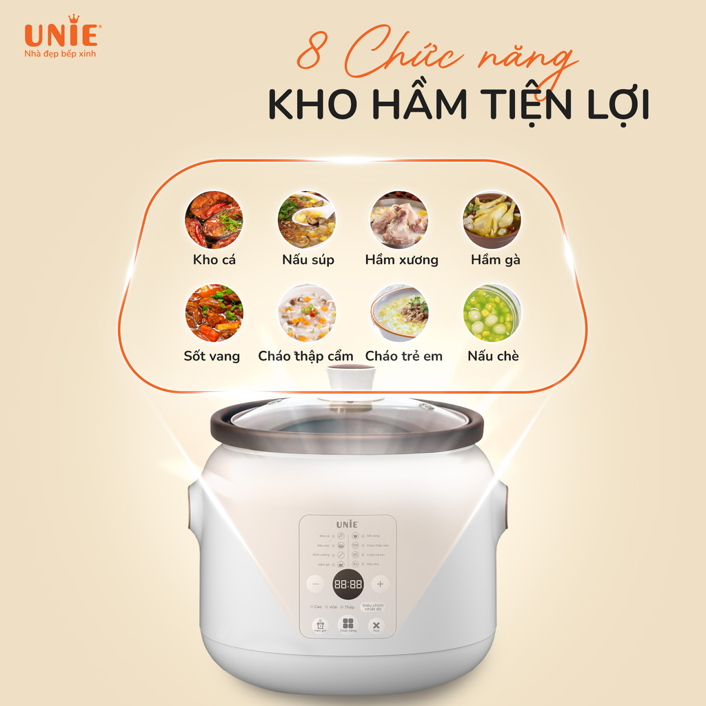 Nấu hầm đa năng 8 trong 1, Unie USC208 cho phép bạn dễ dàng kho cá, nấu súp, hầm xương, hầm gà, sốt vang, cháo thập cẩm, cháo trẻ em, nấu chè.
