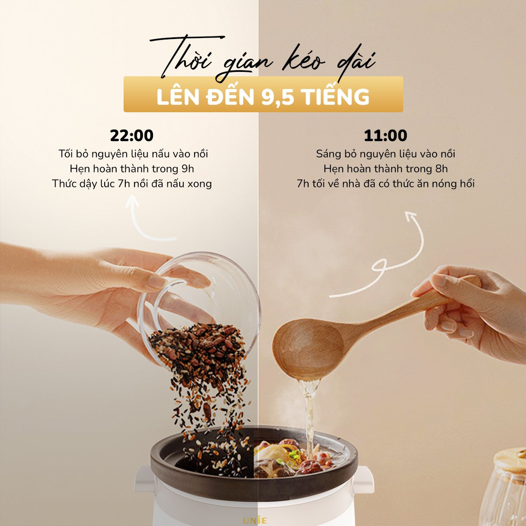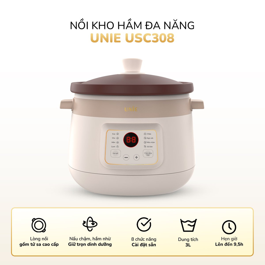 Nồi kho hầm đa năng UNIE USC308 ghi điểm nhờ thiết kế mang hơi hướng vintage với kiểu dáng gọn gàng, màu sắc trang nhã. Sản phẩm là điểm nhấn gian bếp thêm đẹp và ấn tượng. Nồi tích hợp 8 chức năng khác nhau giúp bạn chế biến đa món ăn, tiết kiệm thời gian nấu nướng trong bếp.