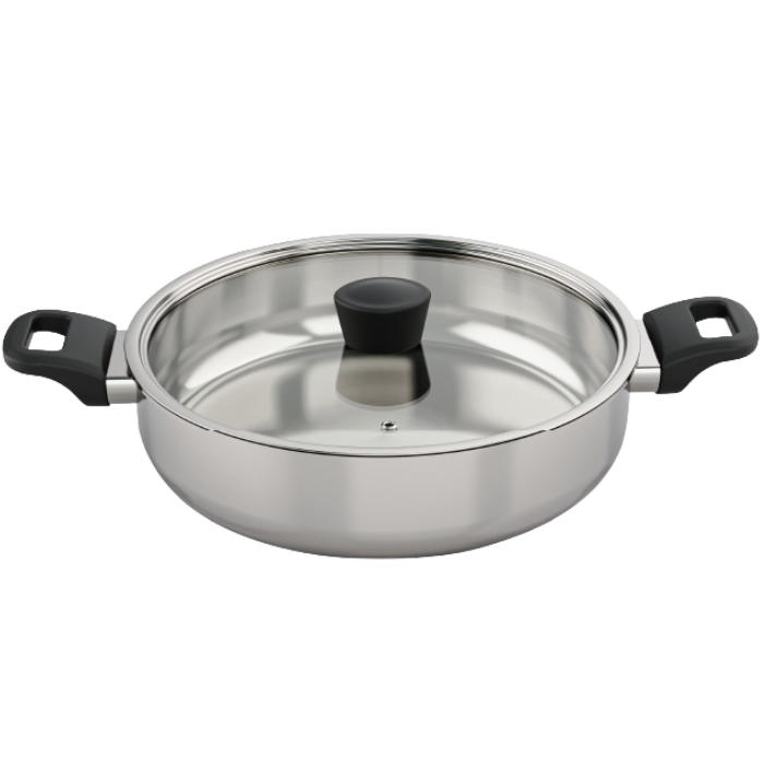 Hai bên nồi được gắn tay cầm inox tán đinh cố định, đảm bảo an toàn khi di chuyển, tránh bỏng tay khi nấu ở nhiệt độ cao. Nắp nồi bằng kính cường lực trong suốt, giúp người dùng dễ quan sát quá trình nấu mà không cần mở nắp thường xuyên.