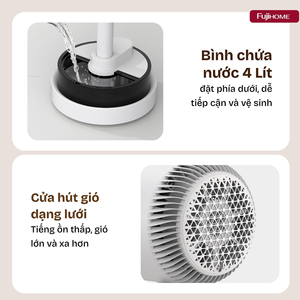 Không chỉ dừng lại ở chức năng làm mát và sưởi, Fujihome AC707 còn được tích hợp bình chứa nước dung tích lớn 4L và tính năng phun sương tạo ẩm, giúp cân bằng độ ẩm trong không khí – đặc biệt hữu ích khi dùng trong môi trường điều hòa, mùa hanh khô hoặc thời tiết nắng nóng kéo dài.