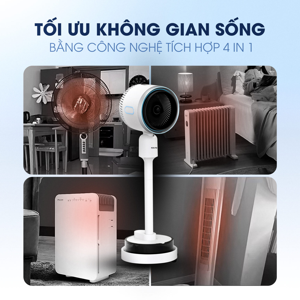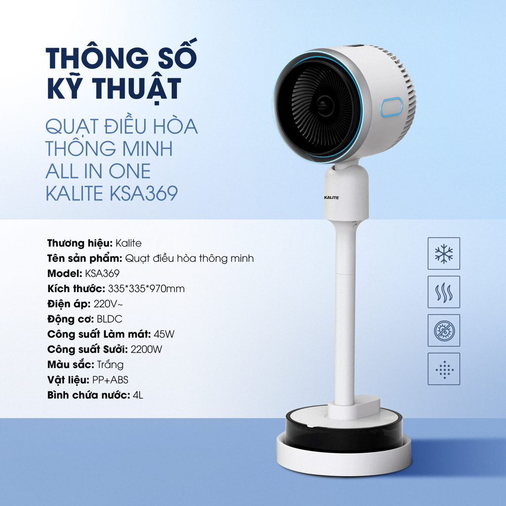 Thay vì phải đầu tư riêng biệt cho 4 thiết bị: quạt làm mát, máy sưởi, máy phun sương và thiết bị diệt khuẩn bằng tia UV, giờ đây bạn chỉ cần duy nhất Kalite KSA369 – giải pháp tích hợp mạnh mẽ và thông minh cho mọi nhu cầu điều hòa không khí trong gia đình.