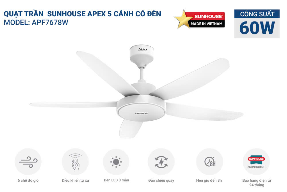Không chỉ đơn thuần là thiết bị làm mát hiệu quả, quạt trần hiện nay còn góp phần tăng tính thẩm mỹ cho không gian sống và nâng cao chất lượng cuộc sống hàng ngày với nhiều thiết kế hiện đại, công nghệ tiên tiến. Nổi bật trong số đó là quạt trần 5 cánh có đèn SUNHOUSE APEX APF7678W, một sản phẩm tích hợp nhiều công nghệ tiên tiến, phù hợp với xu hướng sống xanh và tiện nghi ngày nay.