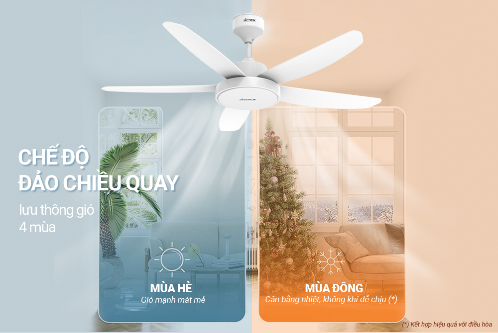 Không chỉ hoạt động hiệu quả trong mùa hè, Quạt trần 5 cánh có đèn Sunhouse Apex APF7678W còn tích hợp chế độ đảo chiều quay lưu thông gió suốt 4 mùa. Vào mùa hè, quạt quay theo chiều xuôi giúp tạo luồng gió mát lan tỏa khắp phòng, hạ nhiệt nhanh chóng, hạn chế việc tích tụ gió tại một điểm. Vào mùa đông quạt đẩy luồng không khí ấm từ trần xuống sàn tạo cảm giác ấm áp, dễ chịu, góp phần điều hòa không khí trong phòng một cách tự nhiên.