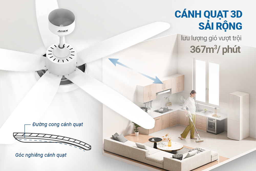 Thiết kế cánh quạt 3D với sải cánh rộng giúp quạt tạo ra lưu lượng gió mạnh mẽ lên đến 367m³/phút, vượt trội hơn nhiều so với các dòng quạt trần thông thường. Thiết kế cánh quạt giúp phân phối đồng đều, làm mát toàn diện, phù hợp với những không gian lớn như phòng khách, phòng ăn.