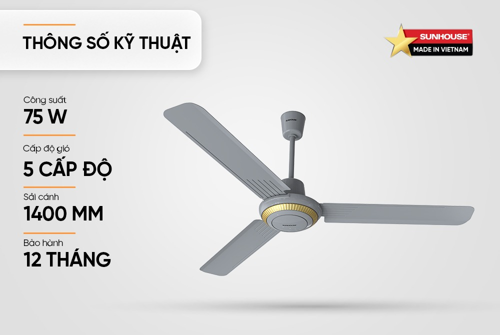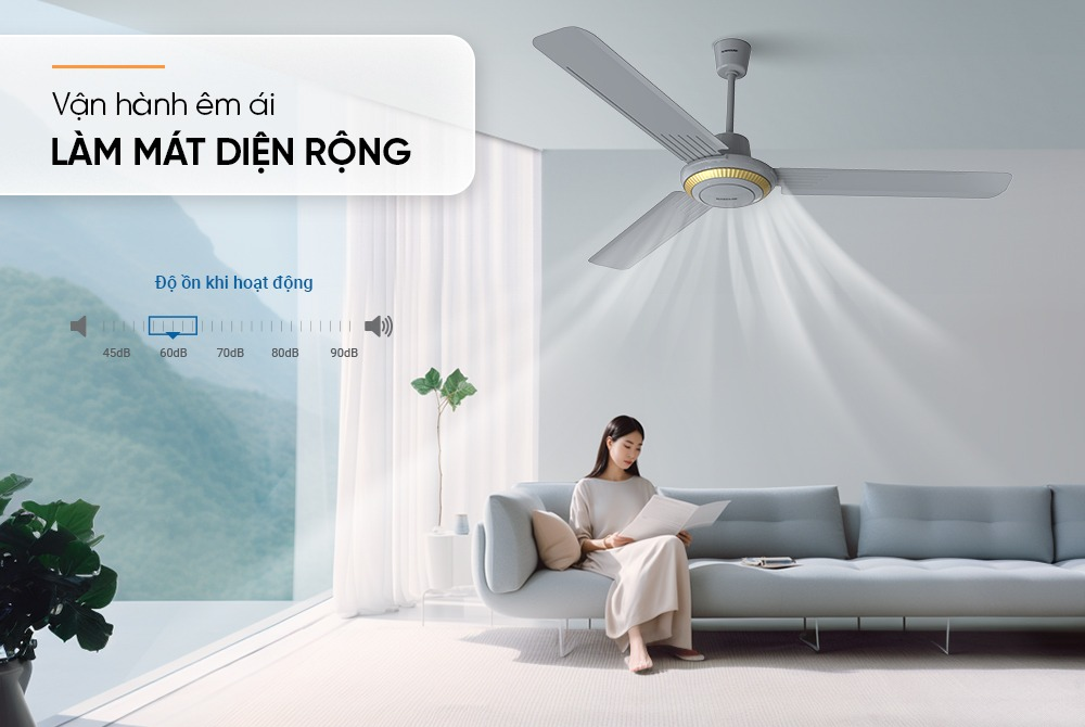 Quạt trần 3 cánh SUNHOUSE SHD7659G vận hành êm ái với độ ồn không quá 65dB, đảm bảo không gian yên tĩnh ngay cả khi hoạt động ở tốc độ cao. Công suất 75W kết hợp sải cánh rộng 1.4m tạo luồng gió mạnh mẽ, lan tỏa mát mẻ khắp không gian, mang lại cảm giác sảng khoái và thoải mái tức thì cho cả gia đình.