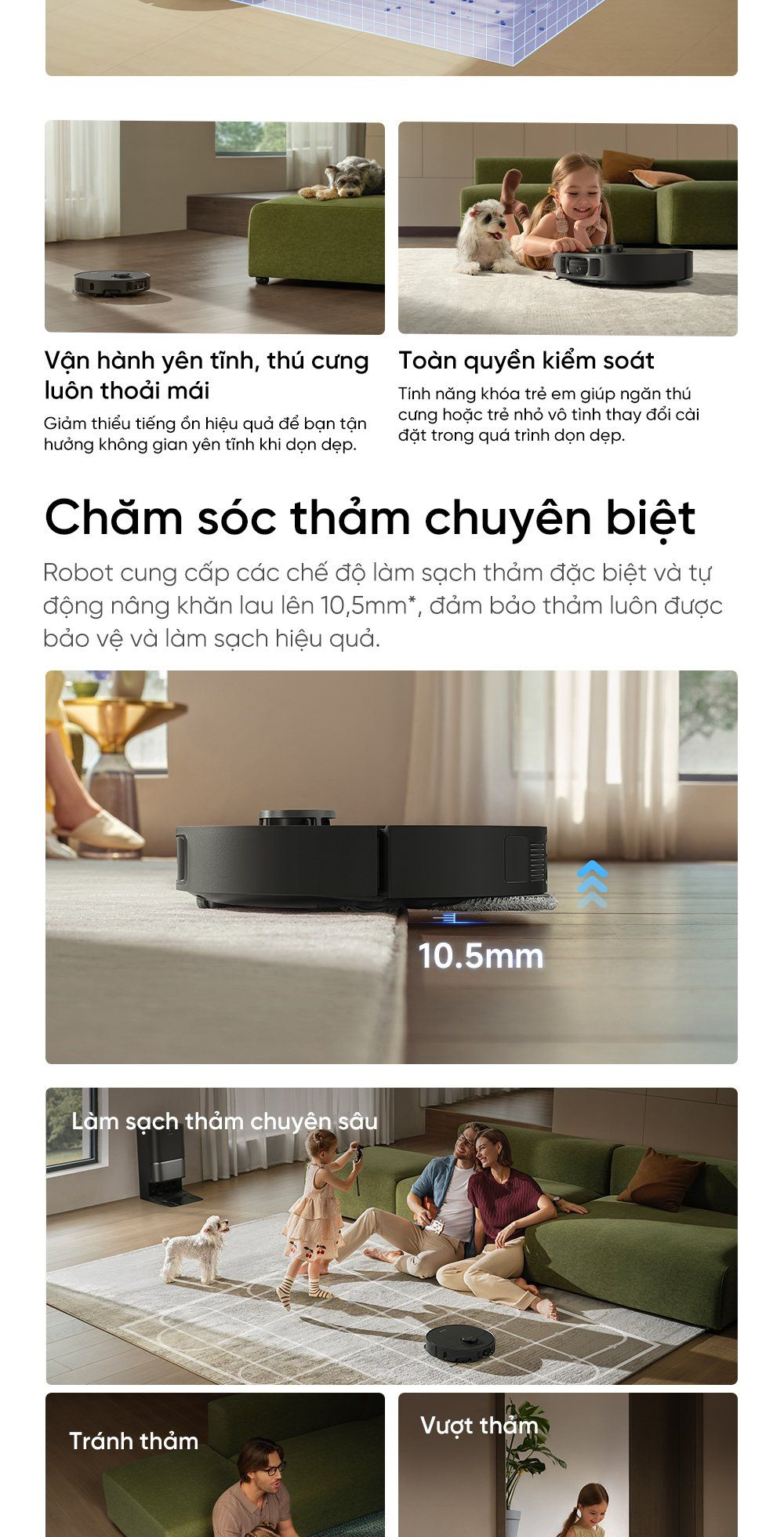 - Chăm sóc thảm chuyên biệt: Robot cung cấp các chế độ làm sạch thảm đặc biệt và tự động nâng giẻ lau lên 10,5mm, đảm bảo thảm luôn được bảo vệ và làm sạch hiệu quả.