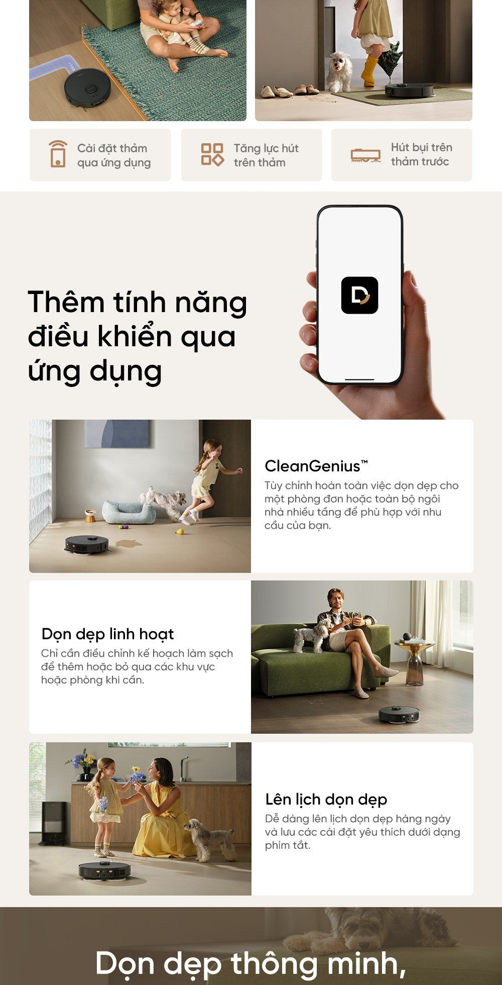 - CleanGenius™: Tùy chỉnh hoàn toàn việc dọn dẹp cho một phòng đơn hoặc toàn bộ ngôi nhà nhiều tầng để phù hợp với nhu cầu của bạn.