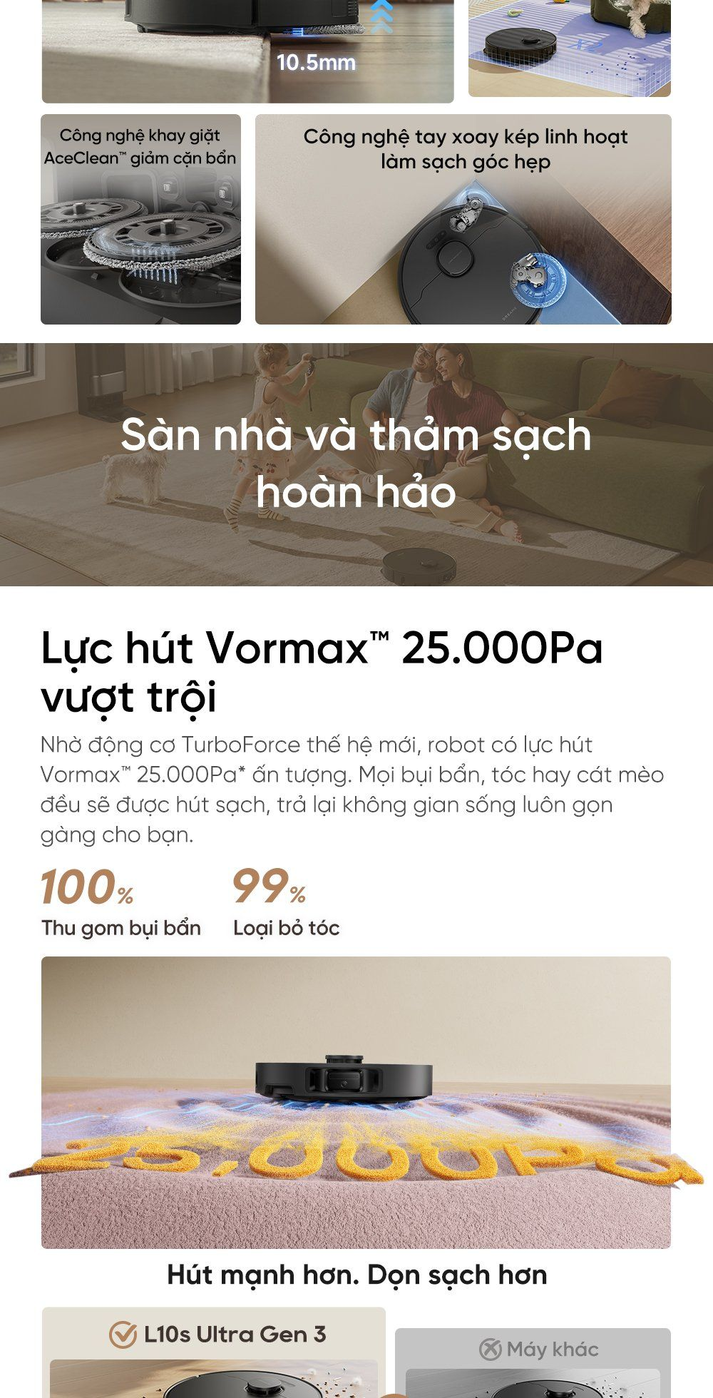 - Lực hút Vormax™ 25.000Pa vượt trội: Nhờ động cơ TurboForce thế hệ mới, robot có lực hút Vormax™ 25.000Pa* ấn tượng. Mọi bụi bẩn, tóc hay cát mèo đều sẽ được hút sạch, trả lại không gian sống luôn gọn gàng cho bạn.