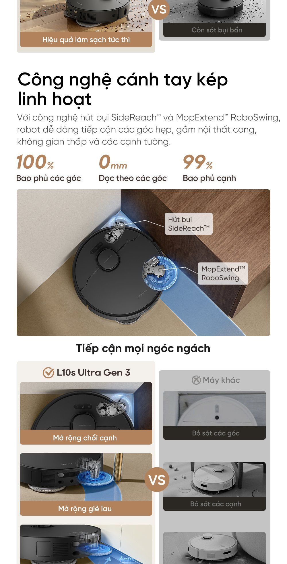 - Công nghệ cánh tay kép linh hoạt: Với công nghệ hút bụi SideReach™ và MopExtend™ RoboSwing, robot dễ dàng tiếp cận các góc hẹp, gầm nội thất cong, không gian thấp và các cạnh tường.