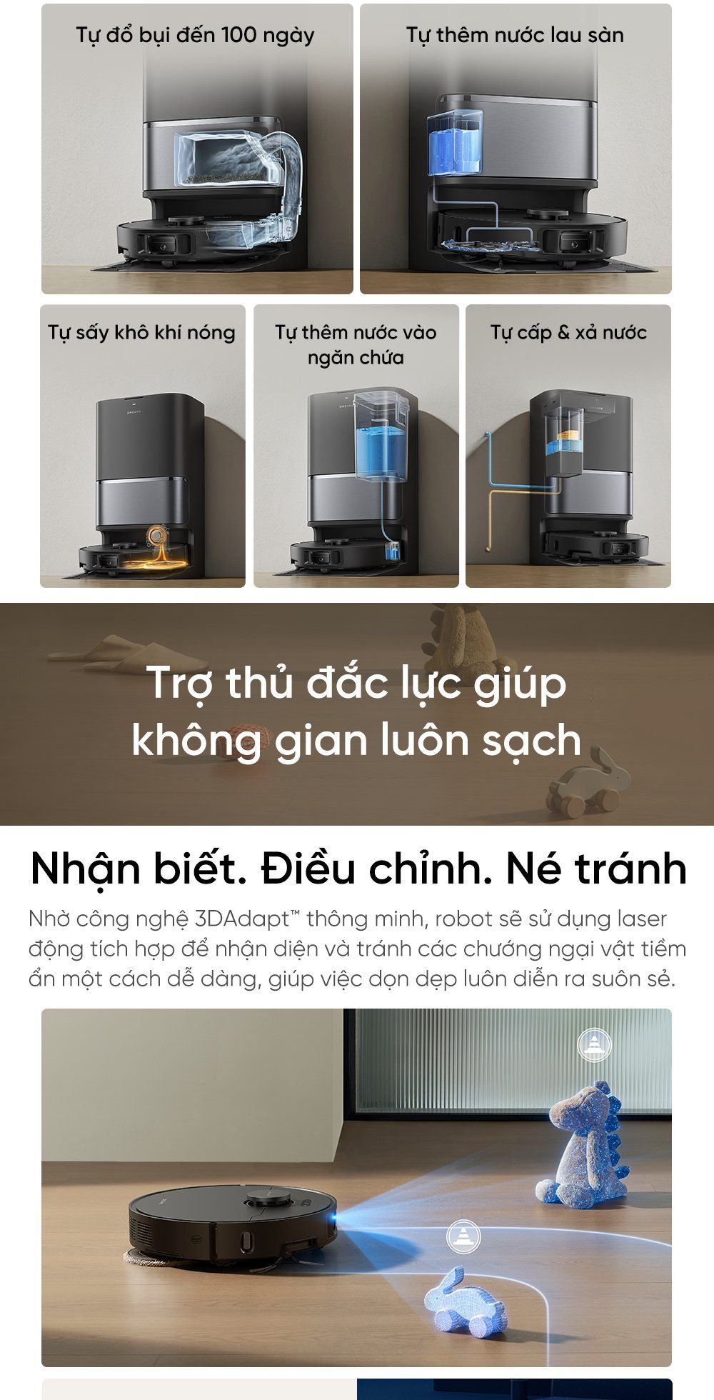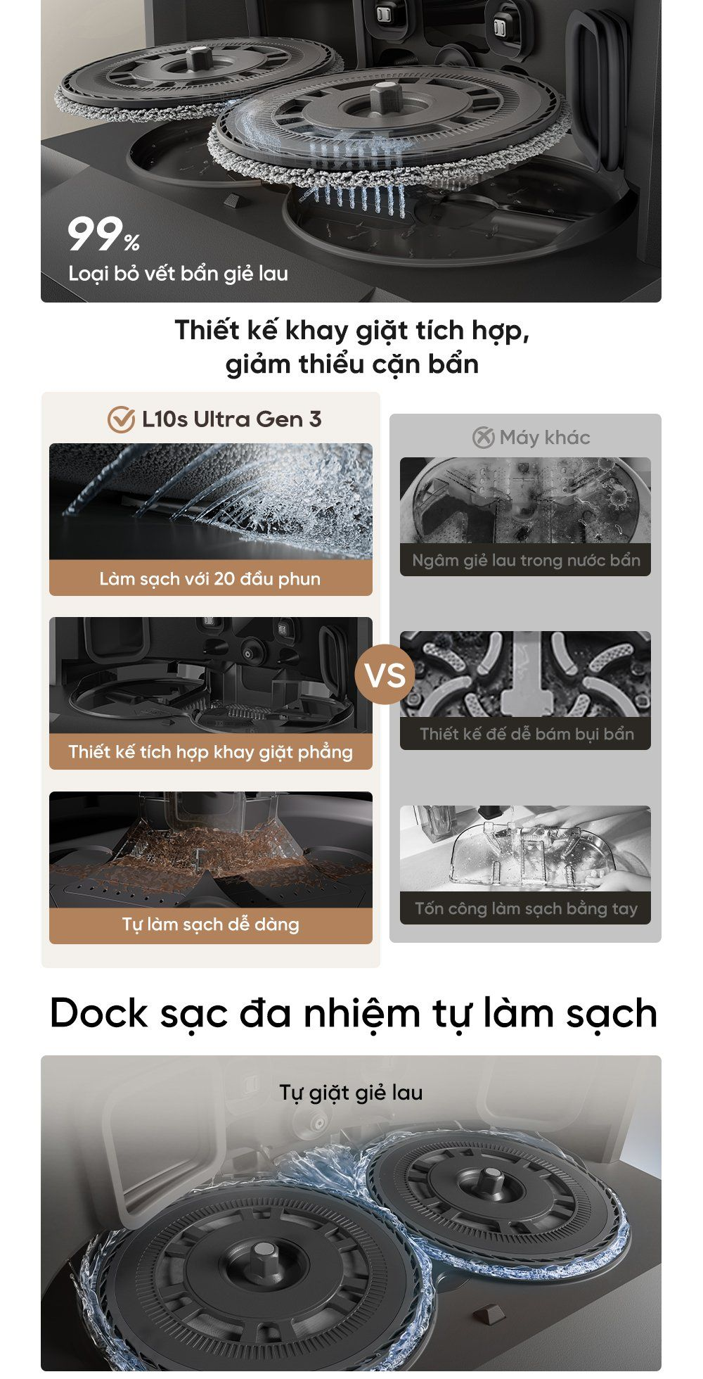 - Dock sạc đa nhiệm tự làm sạch: