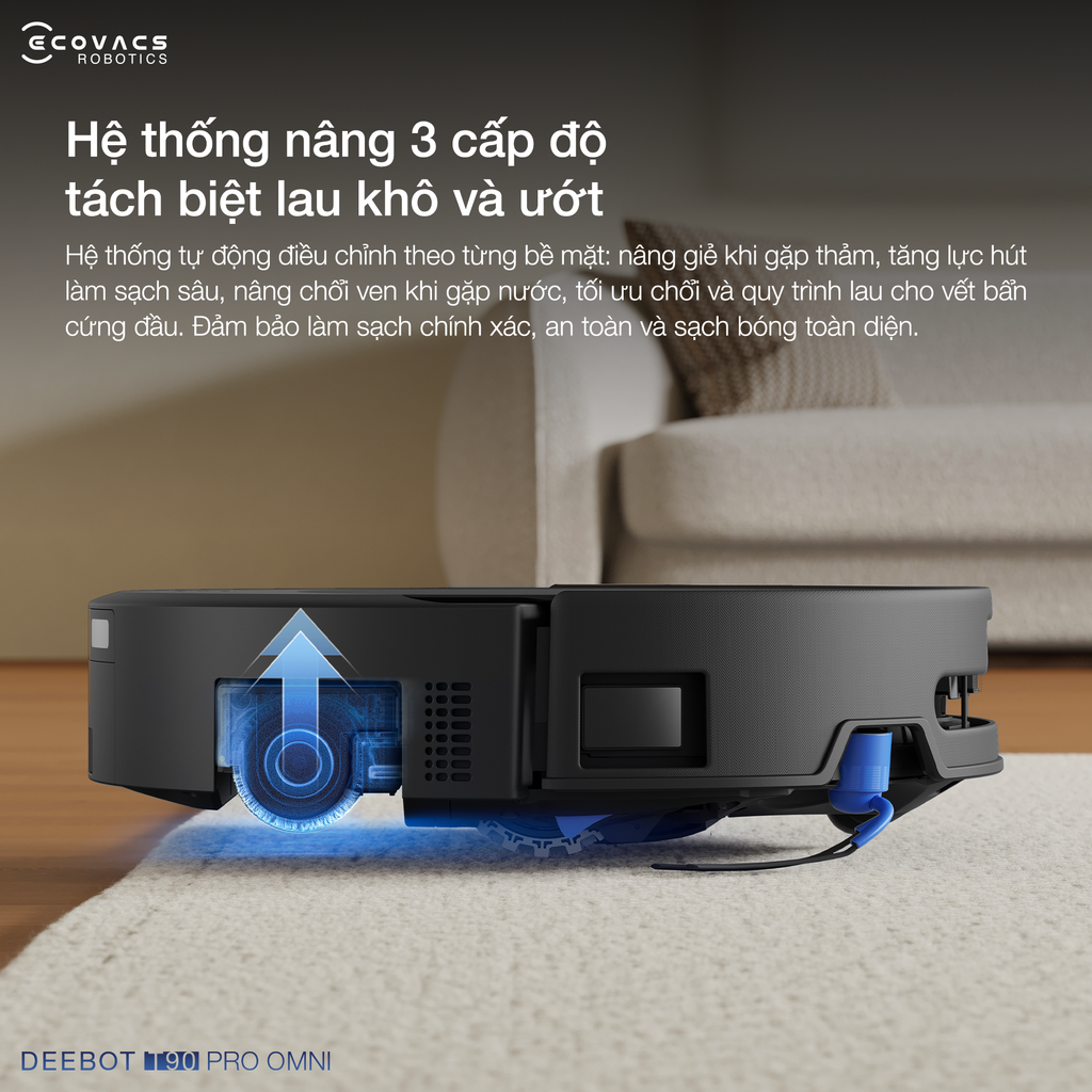 Hệ thống nâng 3 cấp độ của robot hút bụi DEEBOT T90 PRO OMNI mang đến khả năng làm sạch chính xác đồng thời bảo vệ tối ưu mọi loại sàn.