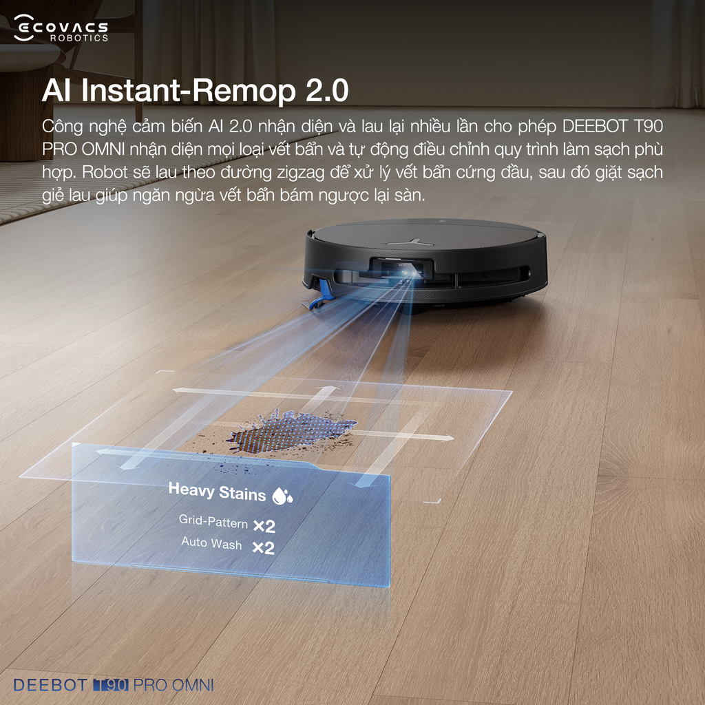Công nghệ nhận diện vết bẩn bằng AI thế hệ 2.0 cho phép robot DEEBOT T90 PRO OMNI tự điều chỉnh phương pháp làm sạch dựa trên loại và mức độ nghiêm trọng của vết bẩn trên sàn nhà.