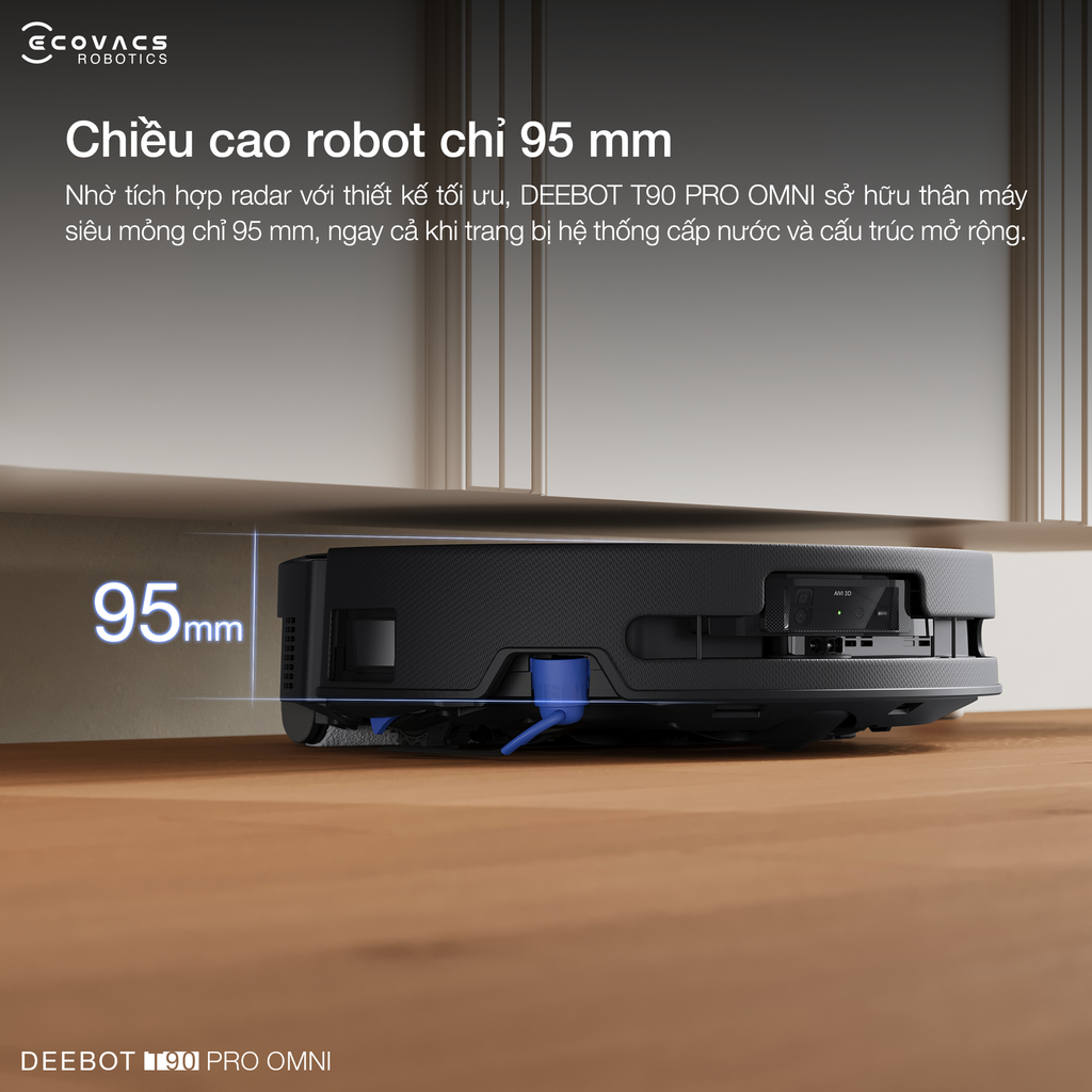 Việc sử dụng radar giấu hoàn toàn vào bên trong thân máy và tối ưu hóa cấu trúc toàn diện, DEEBOT T90 PRO OMNI duy trì thân máy siêu mỏng chỉ 95mm. Thiết kế này giúp robot dễ dàng len lỏi vào các khu vực gầm thấp để làm sạch sâu, ngay cả khi được trang bị hệ thống làm mới nước và cấu trúc mở rộng phức tạp.